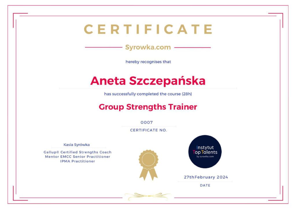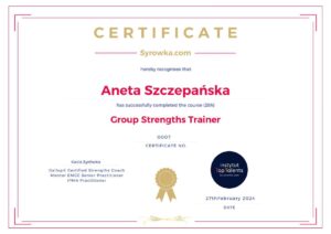 Jako trener pracuję na potencjale i posiadam certyfikat Group Strenghts Trainer. Prowadzę również szkolenia i coaching grupowy